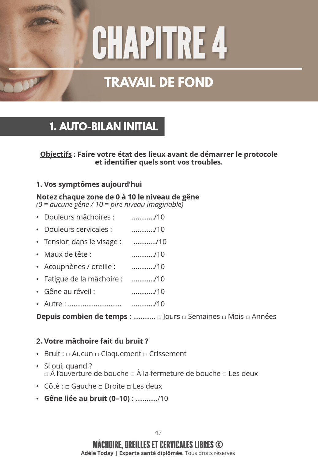 « Afin de rendre accessible ma méthode au plus grand nombre : j'ai conçu la version Starter Pack ! Il est directement extrait de la méthode complète et tu y trouveras : les exercices clés et les protocoles indispensables pour comprendre tes troubles et commencer à soulager tes tensions dès maintenant (mâchoire, visage, cervicales, maux de tête, acouphènes…). C’est le point de départ idéal pour ressentir tes premiers résultats, avant d’aller plus loin en intégrant la méthode complète. »